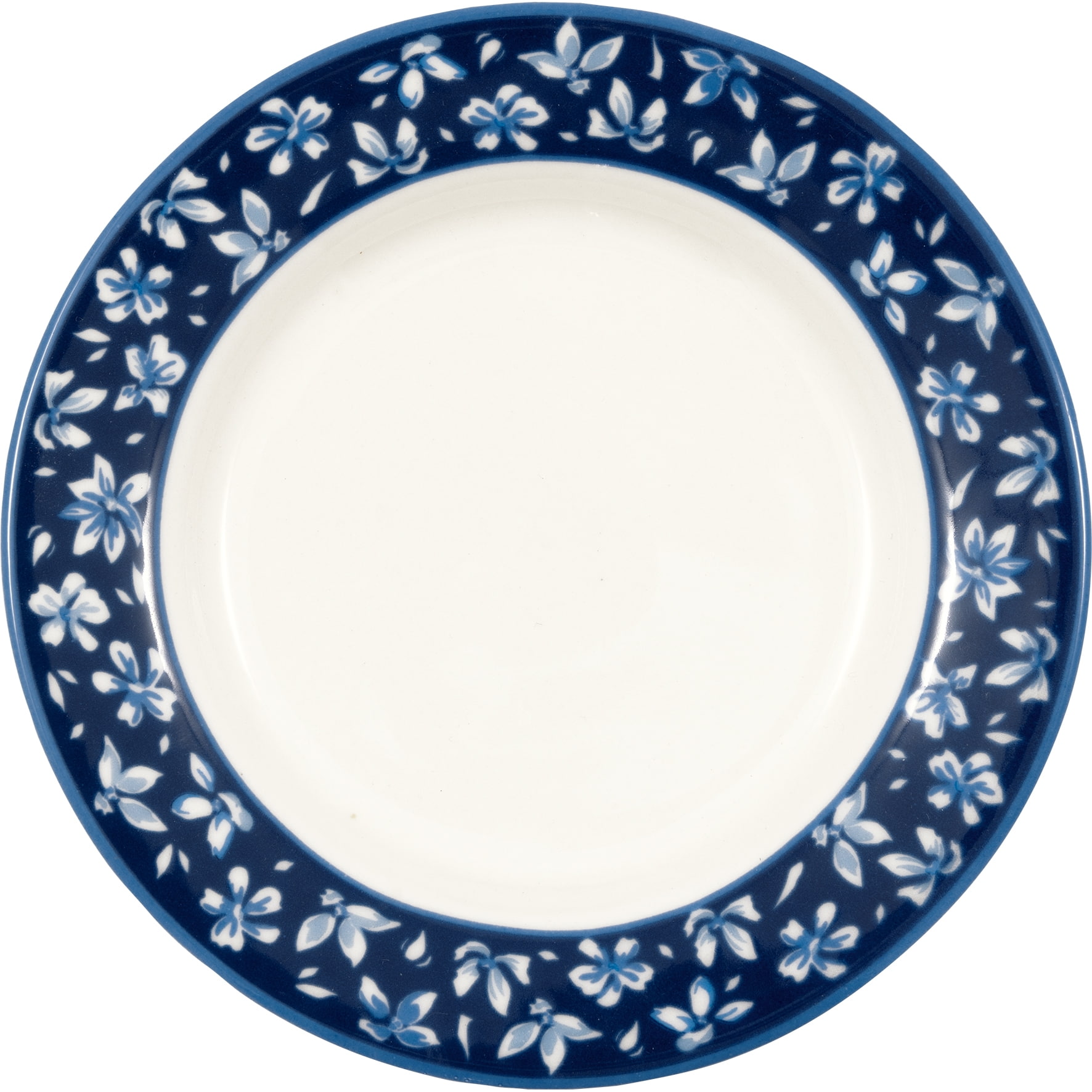 Tanierik z kolekcie Dahla Blue má okraj lemovaný drobným kvetinovým vzorom, ktorý vyniká na námornícky modrom pozadí. Kvetinový pruh je ohraničený tenkými líniami v svetlomodrom odtieni, presne takom istom, aký sa vyskytuje v samotnom kvetinovom zdobení.