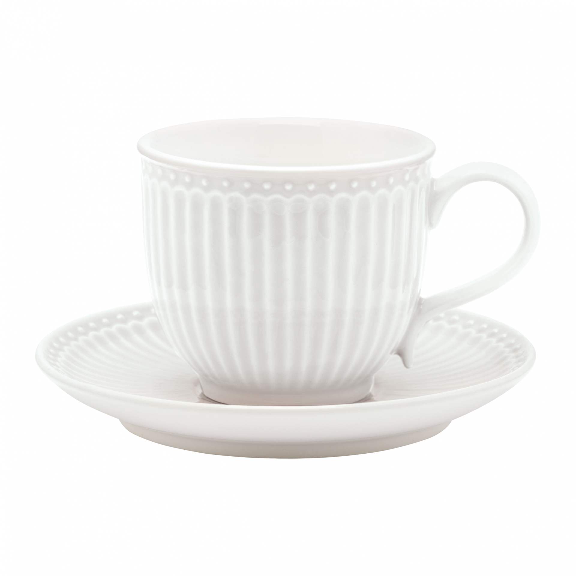 Vychutnajte si obľúbenú popoludňajšiu kávu z romantickej šálky z kolekcie Alice od dánskej značky Green Gate! Šálka aj podšálka majú elegantnú bielu farbu a sú zdobené jemnými vrúbkami, ktoré im dodávajú romantický vintage nádych. Zo šálky Alice vám bude skrátka káva chutiť ešte viac, než obvykle!