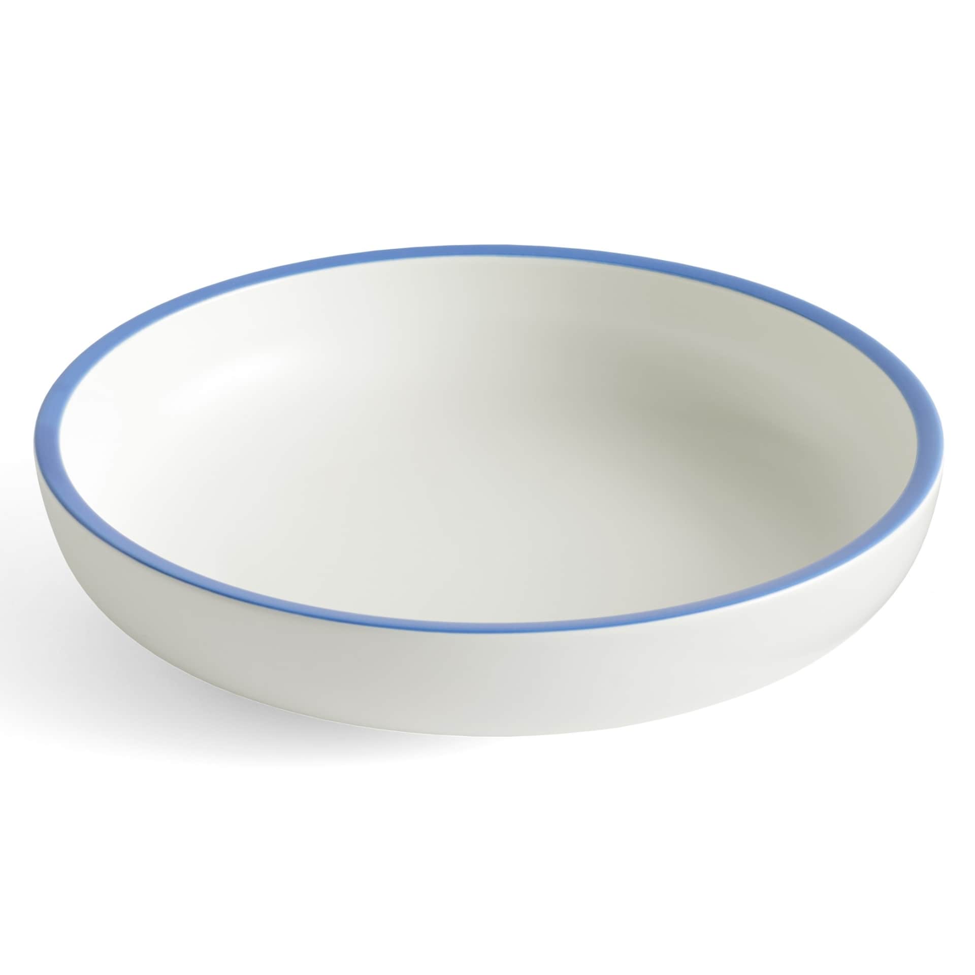 Biela glazúra s modrou linkou po obvode skvele dotvára jej minimalistický dizajn. Doprajte si elegantné stolovanie, ktoré spríjemní každú spoločnú večeru a dodá jej jedinečný a sofistikovaný charakter. priemer 25 cm / výška 4,5 cm Vyrobené zo žiaruvzdorného porcelánu.