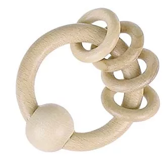 Ľahká drevená hrkálka, ktorá príjemne hrká a podporuje rozvoj zraku, sluchu a hmatu u najmenších detí.