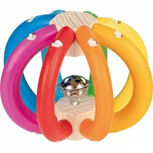 Drevené hrkálka v tvare elastickej loptičky zaujme bábätká pestrofarebným sfarbením a veselou rolničkou. Je príjemná na dotyk a podporuje zmyslové vnímanie a motorický vývoj.