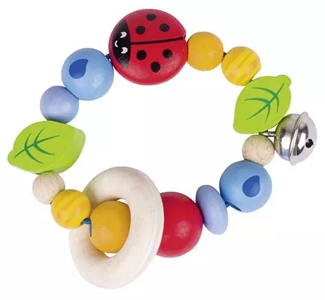Hrkálka s dúhovými perličkami, lienkou, rolničkou, krúžkom a listami, ktoré pri pohybe príjemne hrkajú.