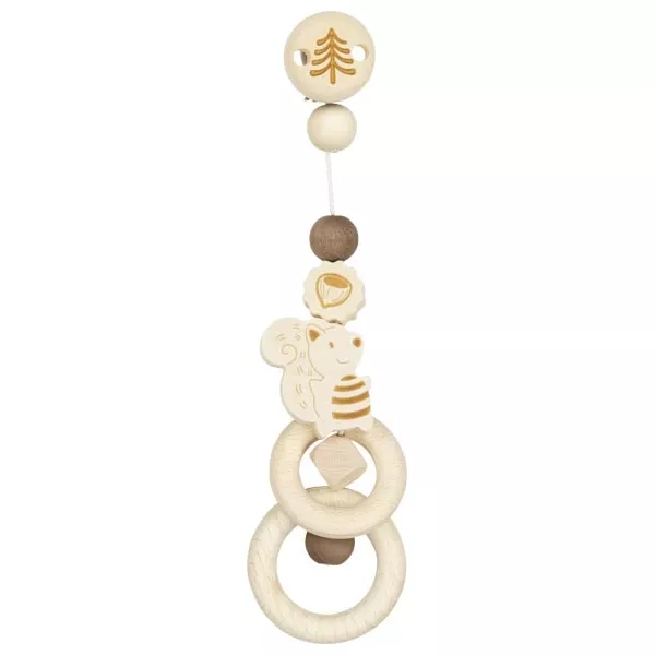Praktická závesná hračka s drevenou veveričkou a klipom na uchytenie na kočík alebo autosedačku. Obsahuje niekoľko herných prvkov usporiadaných tak, aby dieťa podnecovali k hre a skúmaniu.