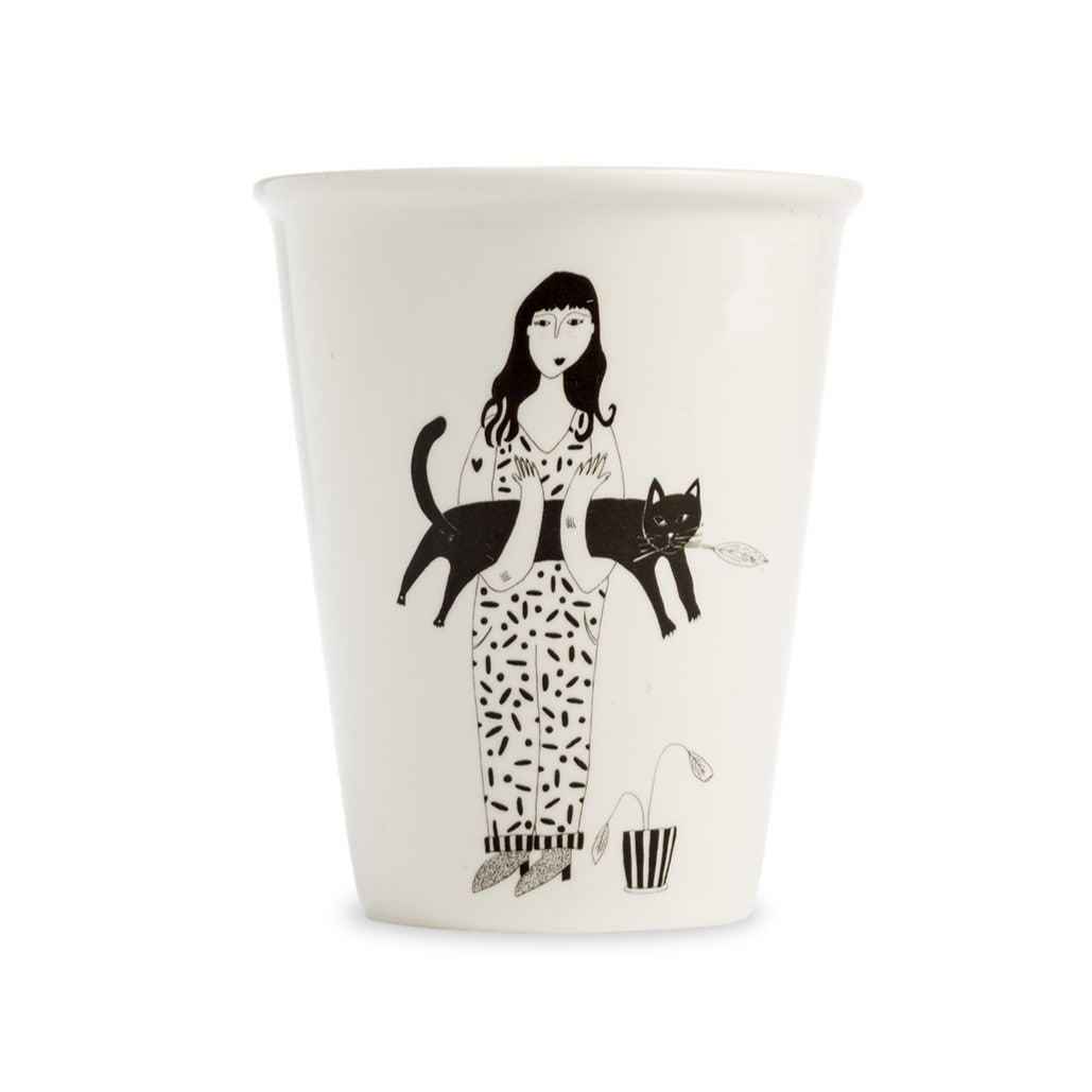 Hrnček je bez uška, má roztvárajúci sa tvar a vystupujúci okraj. Je vyrobený z porcelánu. Okrem jednoduchého tvaru osloví aj autorská ilustrácia Helen Blanchaert, zachytávajúca ženu držiacu v náručí čierneho kocúra.