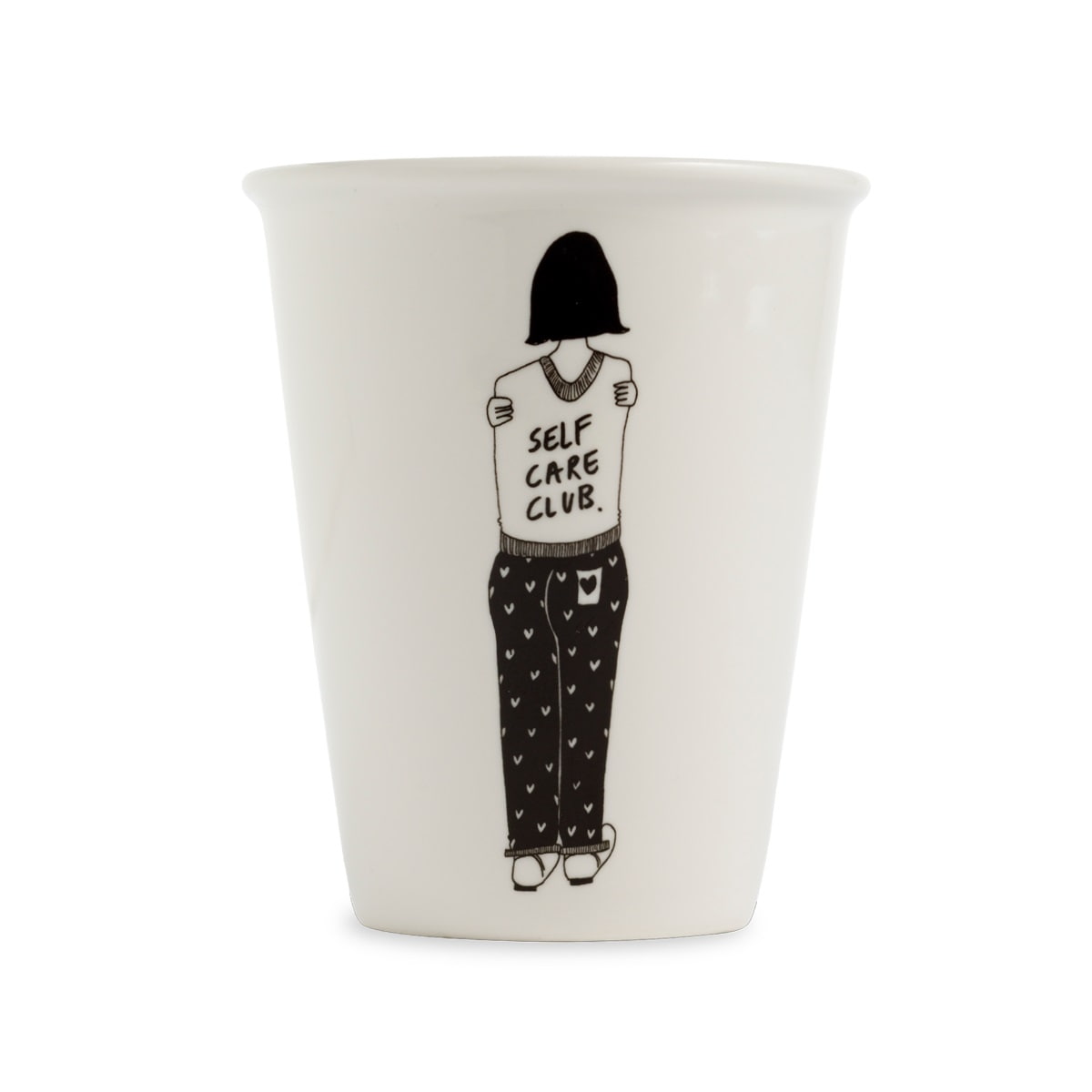 Hrnček je bez uška, má otvárací tvar a vyčnievajúci okraj. Je vyrobený z porcelánu. Okrem jednoduchého tvaru autorská ilustrácia od Helen Blanchaertovej, ktorá nemusí chodiť ďaleko pre humor, zobrazuje mladú ženu, ktorá stojí otočená chrbtom k sebe, objíma sa a má na sebe tričko s nápisom Self Care club.