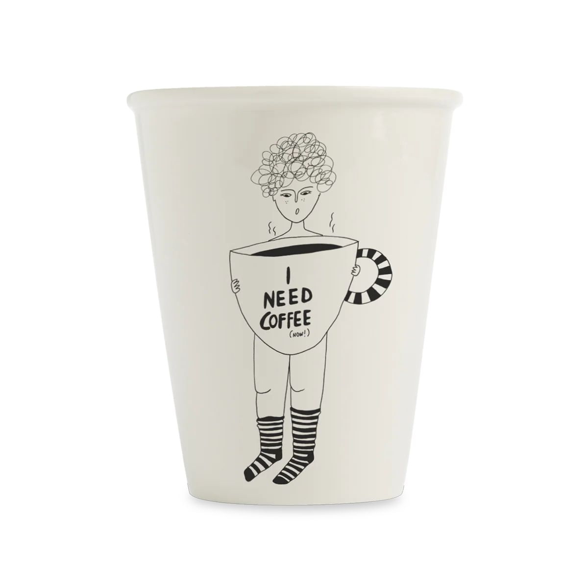 Hrnček je bez uška, má rozšírený tvar a vyčnievajúci okraj. Je vyrobený z porcelánu. Okrem jednoduchého tvaru zaujme autorská ilustrácia od Helen Blanchaertovej, ktorá nejde ďaleko pre humor. Vďaka vtipnej ilustrácii bude hrnček pekným darčekom pre všetkých, ktorí bez rannej kávy nevydržia ani jedno ráno.