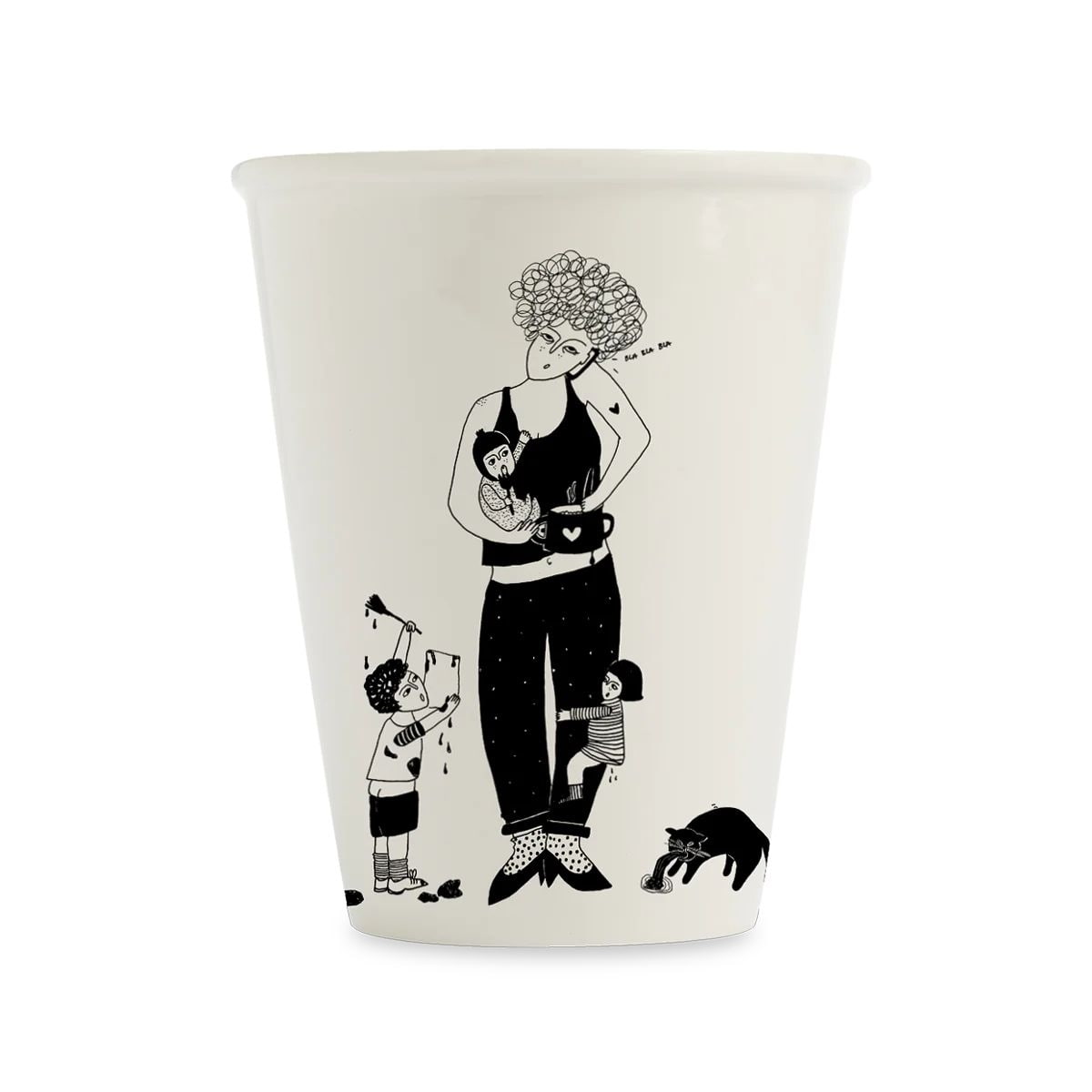 Hrnček je bez uška, má roztvárajúci sa tvar a vystupujúci okraj. Je vyrobený z porcelánu. Okrem jednoduchého tvaru vás určite osloví autorská ilustrácia Helen Blanchaert - že život mamičiek na materskej nie je žiadna dovolenka krásne zobrazuje práve táto vtipná ilustrácia.