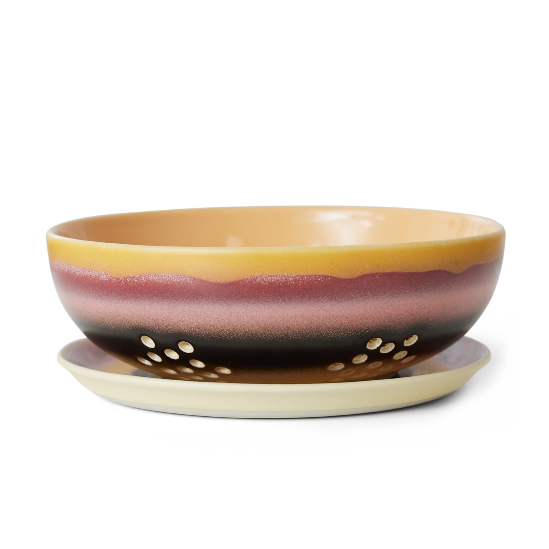 Jedinečné sfarbenie tejto súpravy pripomína západ slnka a je výsledkom reaktívnej glazúry, vďaka ktorej je každý kus doslova jedinečným umeleckým dielom. Preto má každá miska a tanier iné sfarbenie a dekor.
