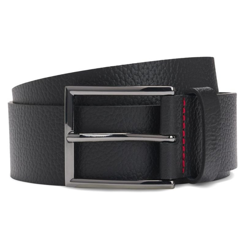 Vlastnosti: Farba: čierna Štýl: príležitostný opasok Zapínanie: kovová pracka v matnom vyhotovení Materiál: 100 % hovädzia koža Šírka opasku: približne 4 cm Logo: vyrazené logo HUGO na špičke opasku