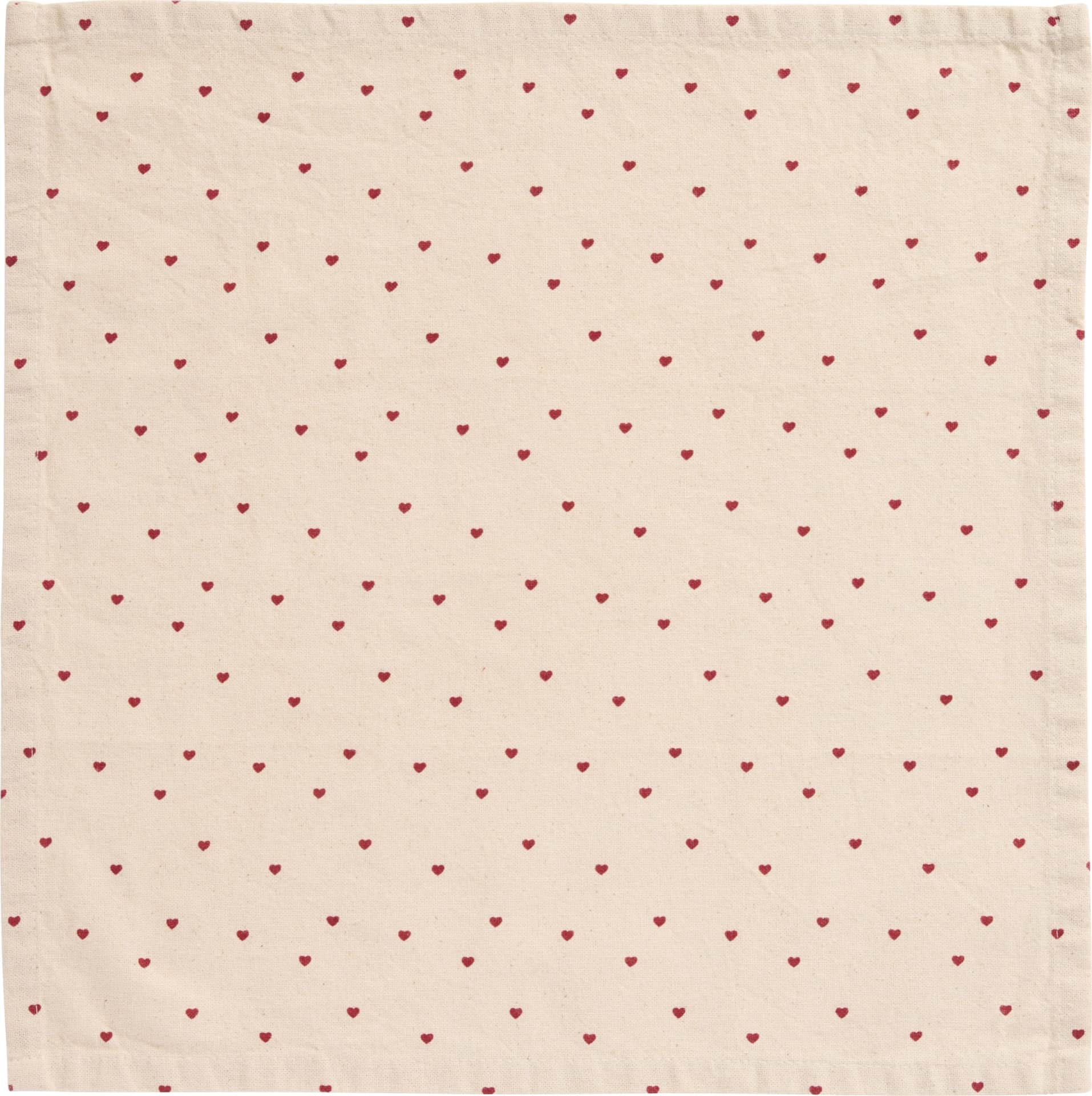 Obrúsok je z veľmi príjemnej bavlny a jeho krémový podklad zdobí motív červených srdiečok. Tento romantický prvok poteší všetkých, ktorí majú radi tradičný štýl prestierania.