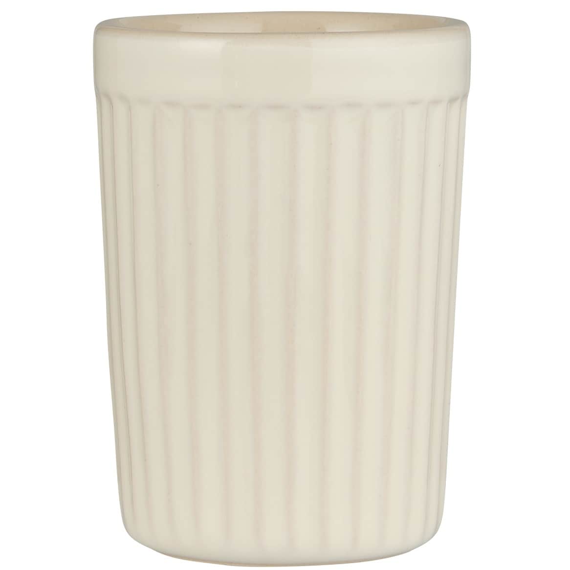 Hrnček je vyrobený z kameniny a má jednoduchý valcovitý tvar. Z vonkajšej strany ho pokrýva svetlá, krémová glazúra, ktorou efektne prestupujú plastické vrúbky po obvode.
