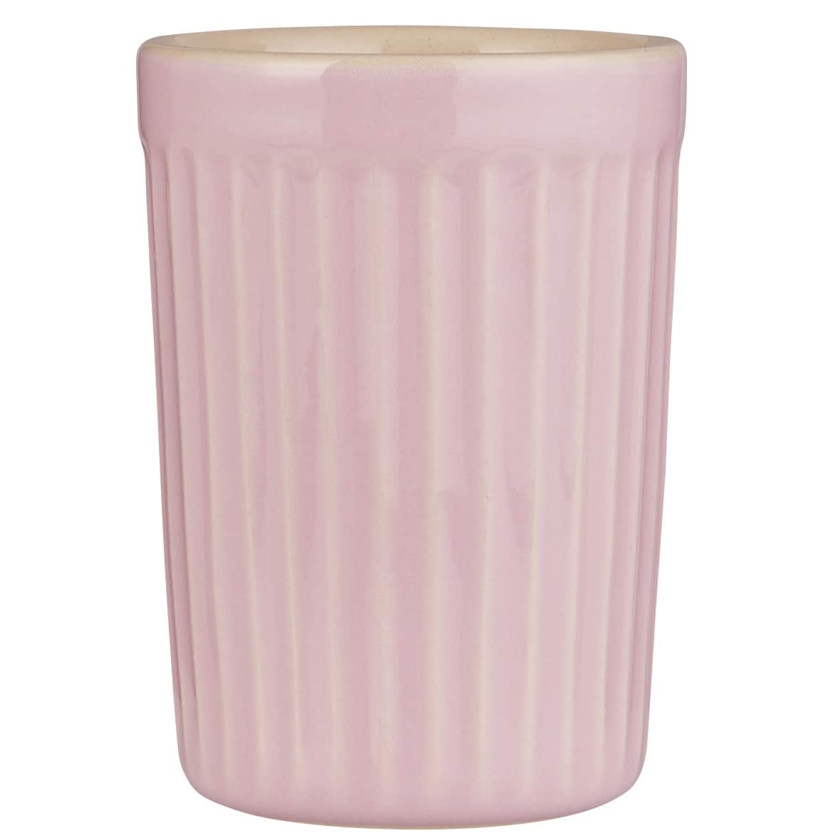 Hrnček je vyrobený z kameniny a má jednoduchý valcovitý tvar. Z vonkajšej strany ho pokrýva svetloružová glazúra, ktorou efektne prestupujú plastické vrúbky. Vnútro je potom vyliate krémovou glazúrou. Spoločne sa tieto nežné farby krásne dopĺňajú.