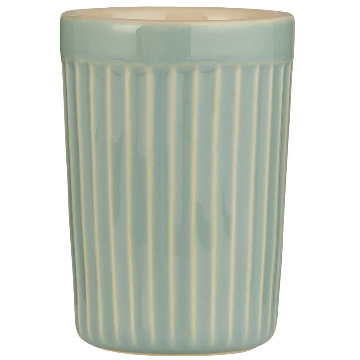 Hrnček je vyrobený z kameniny a má jednoduchý valcovitý tvar. Z vonkajšej strany ho pokrýva tlmene zelená glazúra s jemne modrým podtónom, ktorou efektne prestupujú plastické vrúbky. Vnútro je potom vyliate krémovou glazúrou. Tieto farby sa navzájom krásne dopĺňajú.