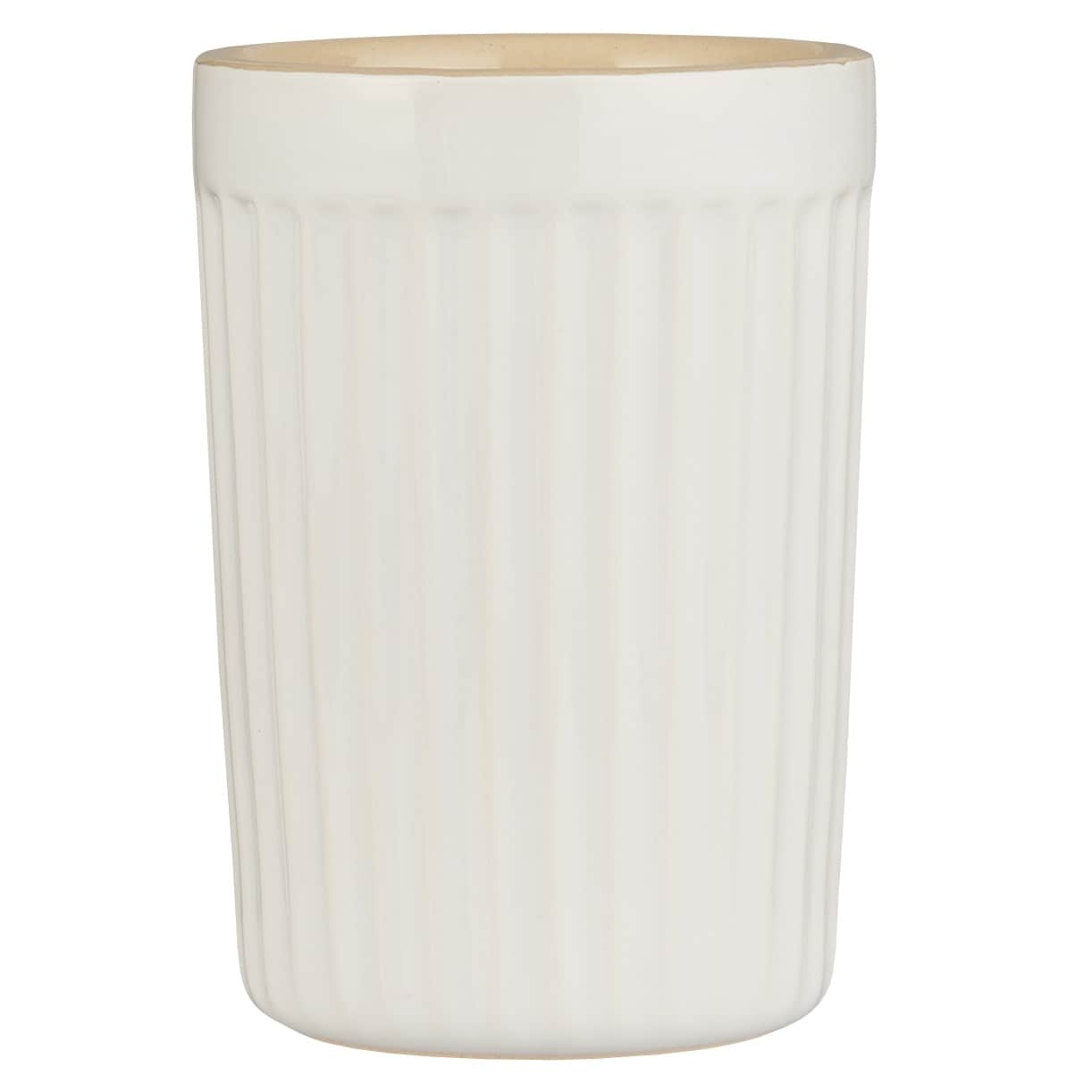 Hrnček je vyrobený z kameniny a má jednoduchý valcovitý tvar. Z vonkajšej strany ho pokrýva tlmene biela glazúra, ktorou efektne prestupujú plastické vrúbky. Vnútro je potom vyliate krémovou glazúrou. Tieto farby sa navzájom krásne dopĺňajú.