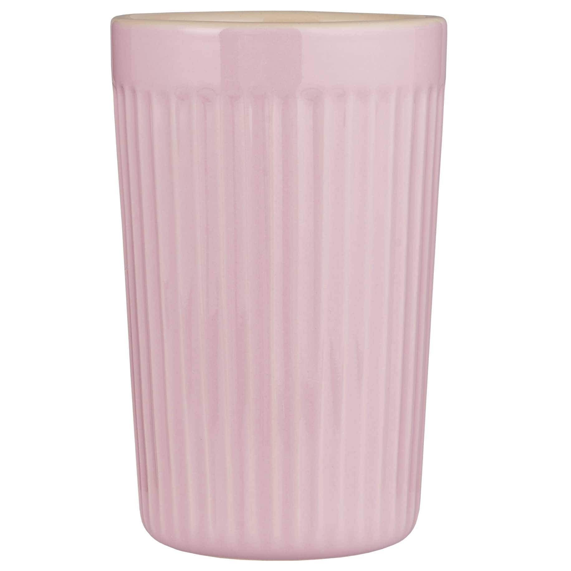 Latte hrnček má jednoduchý valcovitý tvar. Po obvode ho pokrýva ružový odtieň, ktorým prestupuje plastický dekor v podobe jemných vrúbkov. Tie mu dodávajú ešte atraktívnejší vzhľad. Vnútro je potom vyliate krémovou glazúrou, ktorá spoločne s odtieňom English Rose krásne rezonuje.