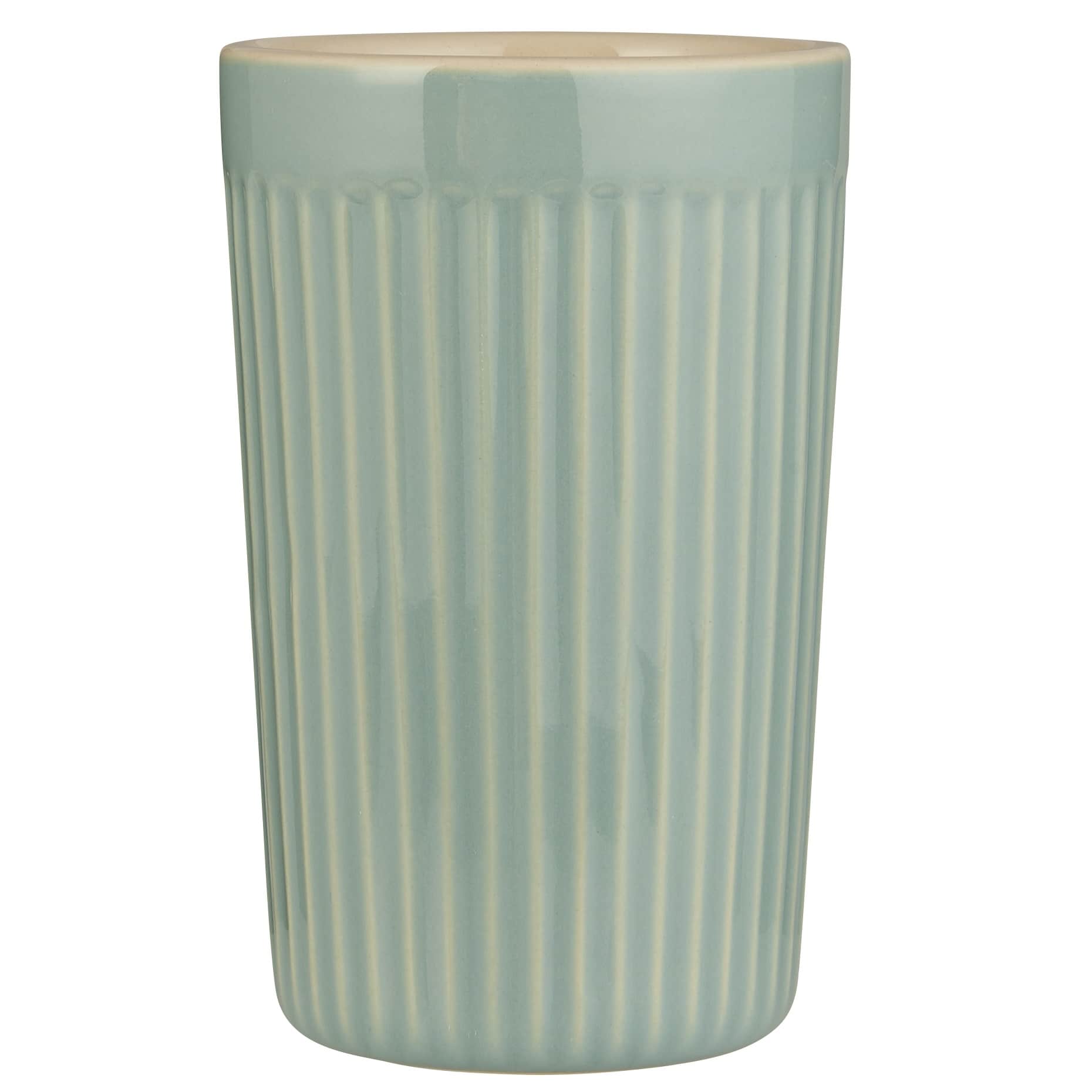 Latte hrnček má jednoduchý valcovitý tvar. Po obvode ho pokrýva zelenomodrý odtieň, ktorým prestupuje plastický dekor v podobe jemných vrúbkov. Tie mu dodávajú ešte atraktívnejší vzhľad. Vnútro je potom vyliate krémovou glazúrou, ktorá spoločne s odtieňom Green Tea krásne rezonuje.