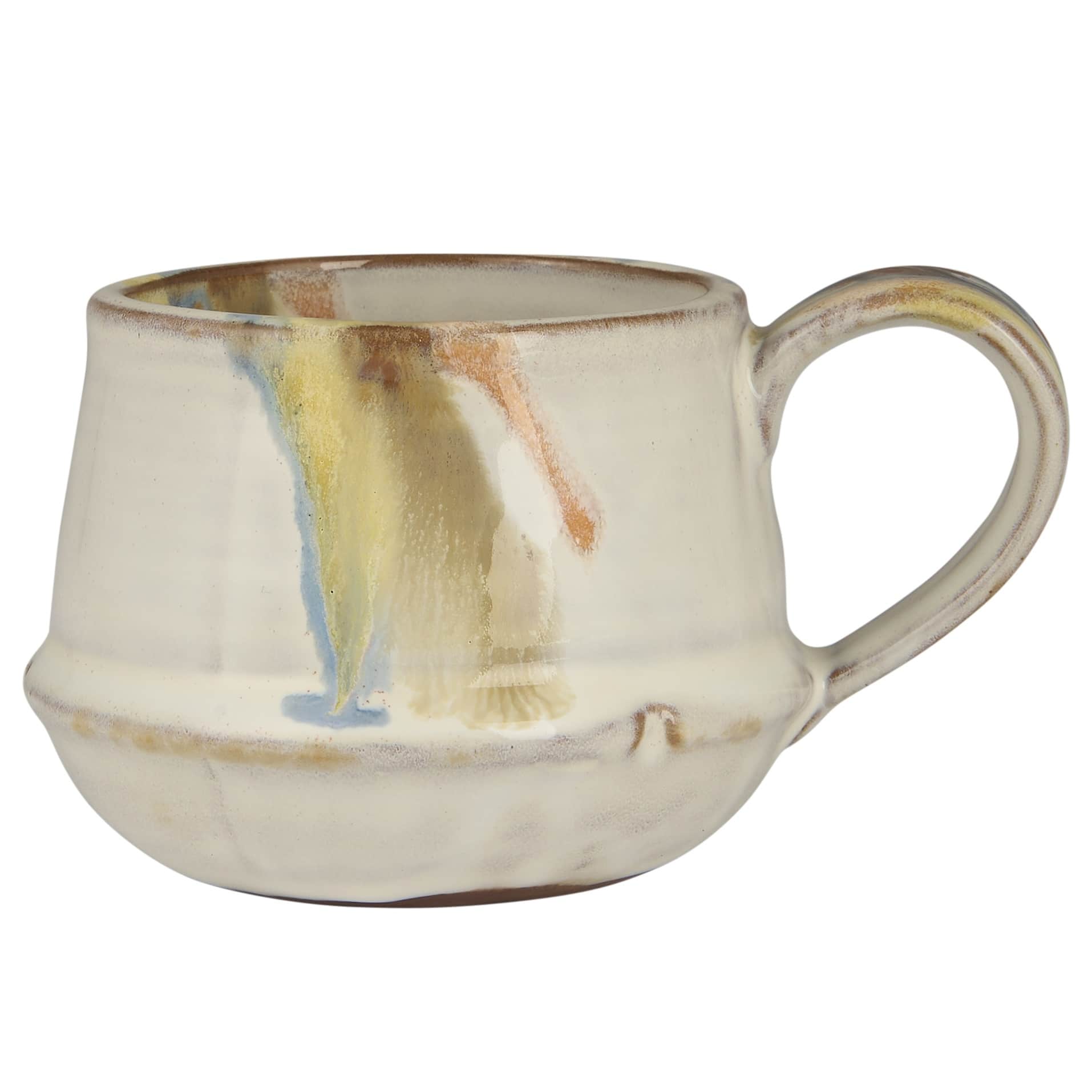 Klasický zaoblený tvar s praktickým držadlom dopĺňa glazúra v tónoch oranžovej, modrej a žltej. Farebné odtiene sa na povrchu hrnčeka prelínajú v abstraktnom vzore. Vďaka tomu je každý kus úplným originálom a prináša do vášho stolovania nádych hravosti a umeleckého štýlu. objem 200 ml / výška 6,5 cm Ručne vyrobené z keramiky.