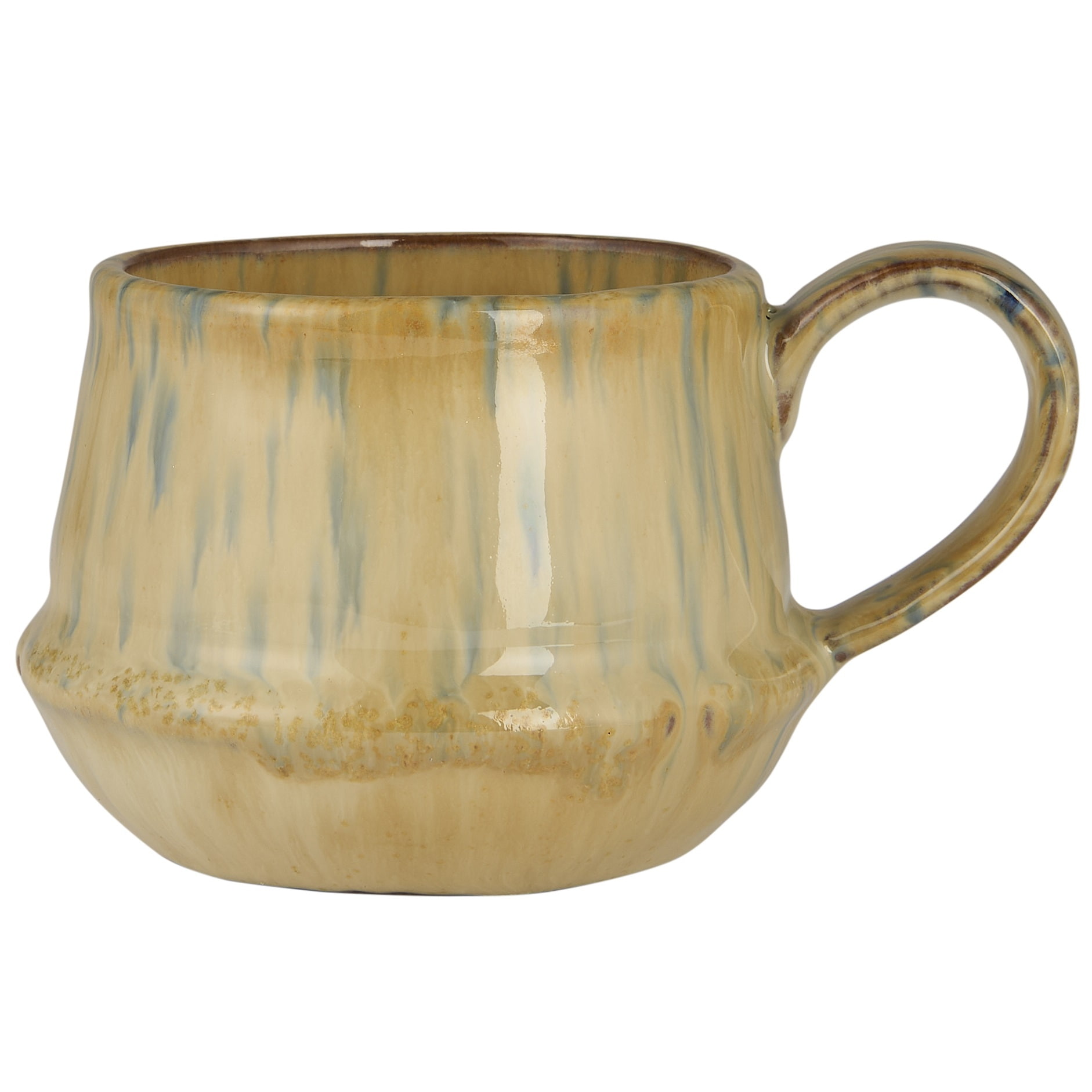 Klasický zaoblený tvar s praktickým uchom dopĺňa glazúra v teplom horčicovom odtieni, ktorú zdobia jemné zvislé pruhy v modrej farbe. Vďaka ručnému glazovaniu je každý hrnček originál.