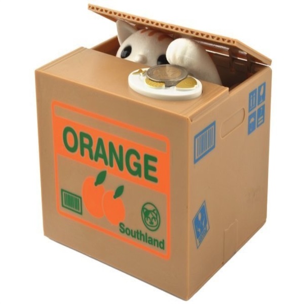 Originálna pokladnička v tvare krabice s ocelotom (mačkovitá šelma), ktorému keď položíte na tácku kovové peniaze, tak vystrčí packu a peniaze zhrabne dovnútra. Je to skvelý darček pre každého.