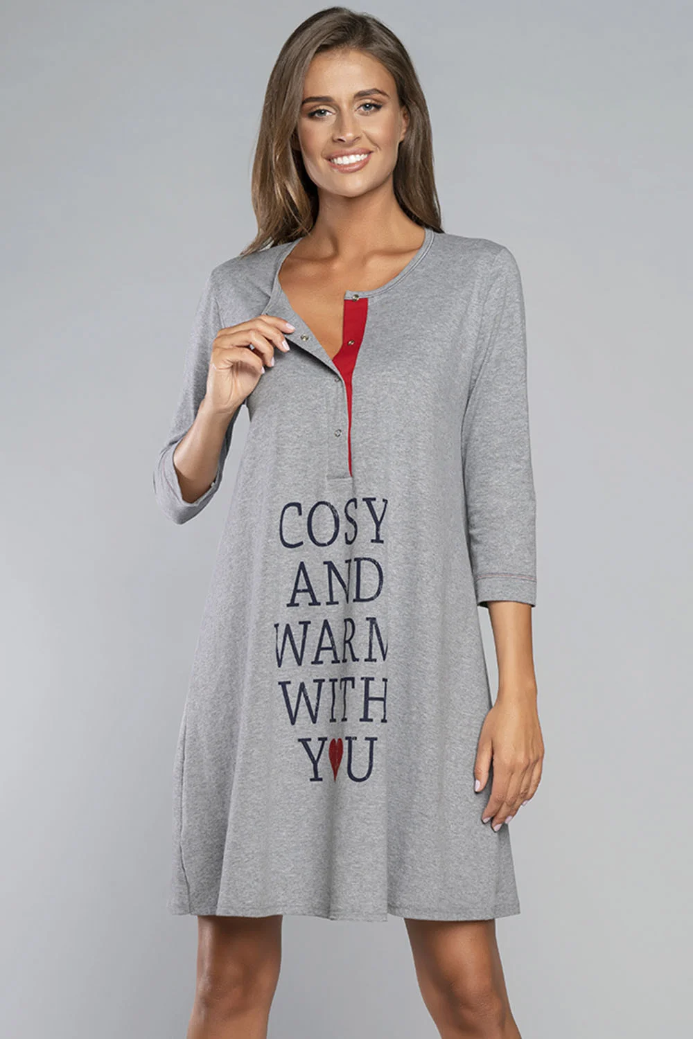 Nočná košeľa značky Italian Fashion, model Balsam 3/4. Výrobok je vyrobený zo 100% bavlny. vlastnosti výrobku: darček pre tehotné dojčiace matky. nočná košeľa so zapínaním na patentky. dámske oblečenie. miesto zapínania: vpredu. dĺžka rukávov: 3/4. typ výstrihu: okrúhly. tehotenské oblečenie.