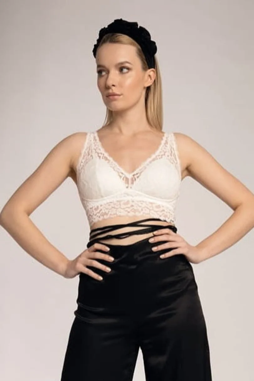 Mäkká čipkovaná podprsenka vyrobená výhradne z čipky. Trojuholníkový tvar košíčkov s penovou výplňou. Braletka má tradičné zapínanie na háčik a očko. Zloženie: 60% polyamid, 16% polyester, 10% bavlna, 7% elastan, 7% ostatné .