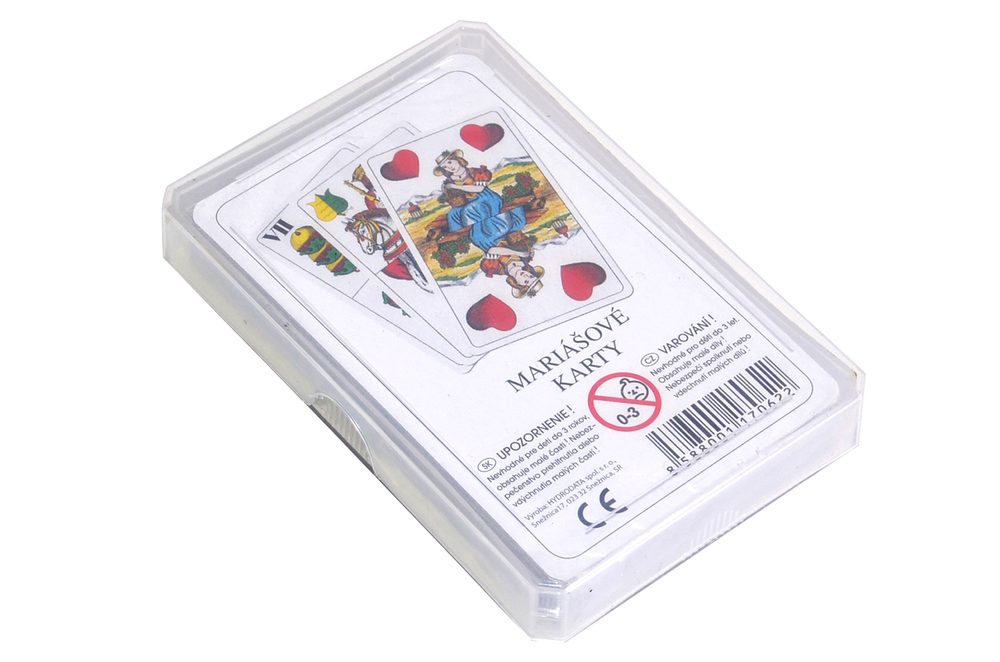 Karty Mariáš v plastovej krabičke Obľúbené hra karty Mariáš. Pre všetky druhy mariáša, kúpte si karty naše. Balené v spastové krabičke. Mariáš - zdvihové hra pre 2-4 hráčov. Hrá sa s balíčkom 32 kariet nemeckého typu. Karty sú buď jednohlavé alebo dvojhlavé. V Marias sa karty označujú podľa symbolov: srdce (alebo tiež červené), žalude, listy (alebo zelené) a kule. Rozmer karty: 10 x 6,2 cm Počet hráčov: 2 + Približná doba hrania: 20 min Vyrobené v Českej republike
