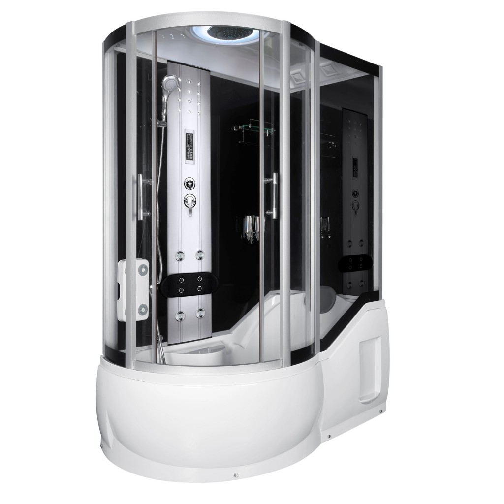 Hydromasážna kabína Fantasia Duo pravá Technické údaje: Rozmery: Výška: 217 cm Šírka; 85 cm Hĺbka: 151 cm Hliníkové profily saténové Dvojité posuvné dvere 5mm tvrdené sklo priehľadné, zadná strana čierna Rozmery sprchovej vaničky: Výška: 65 cm Šírka: 85 cm Hĺbka: 151 cm Celková hĺbka: 33 cm Jednoprúdové pohyblivé hydromasážne trysky Kabína je vybavená ovládacím panelom s možnosťou pripojenia telefónu, rádia, ventilátora, LED osvetlenia, masážneho prístroja na nohy, sklenené police s madlom. Súčasťou je odvodnenie a zacvakávacia zátka (GT) Ean: 5907548107947