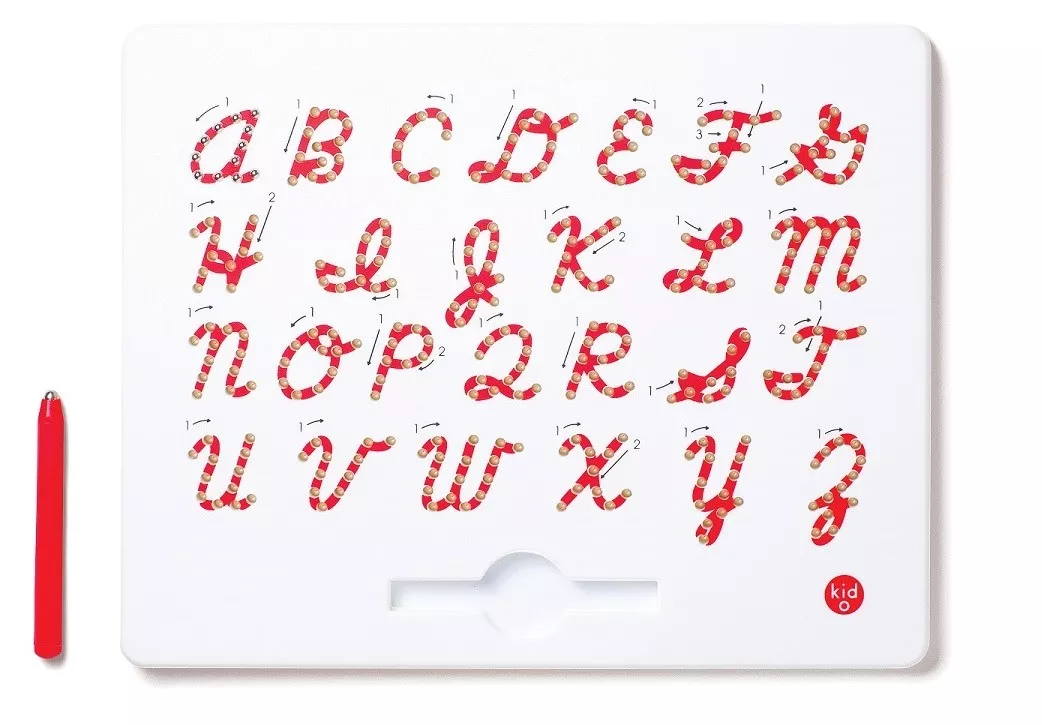 Magnetická tabuľka Kid O je určená pre nácvik správneho písania veľkého písacieho písma. Skladá sa z magnetických guličiek a magnetického pera; dieťa podľa nakreslených šípok obkresľuje líniu písmena správnym smerom. Pri písaní dieťa cíti a počuje, ako magnetické guličky priťahuje pero, čím sa vytvára správny tvar písmena.