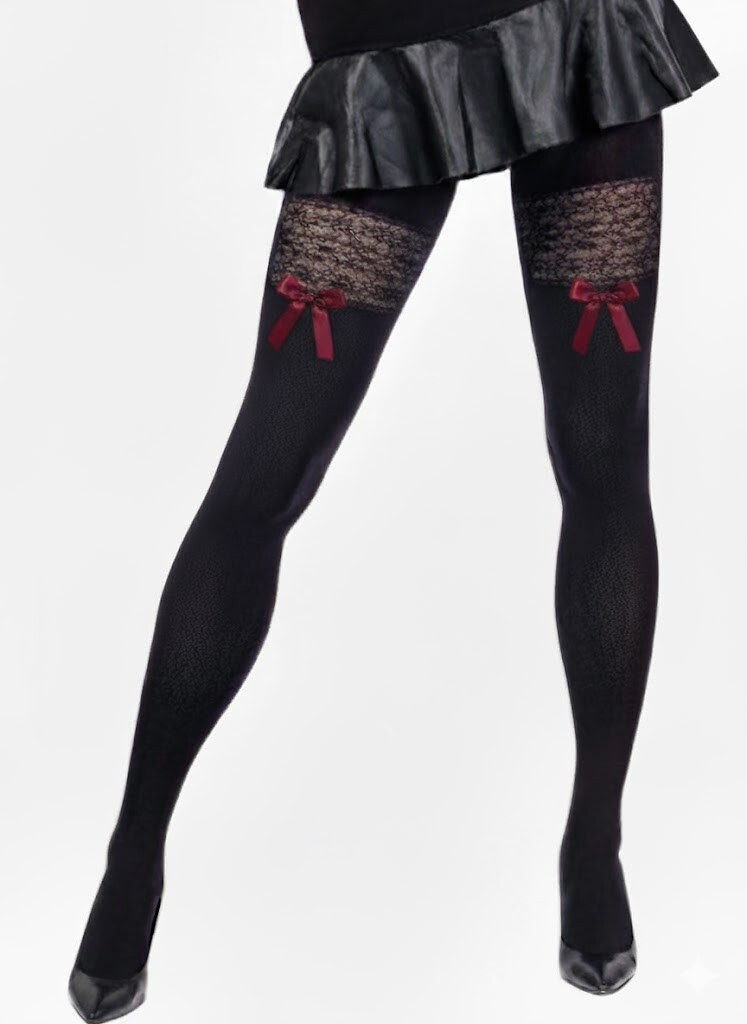Pančuchy imitujúce pančuchy - mäkká, nepriehľadná pletenina - jemná károvaná štruktúra väzby - hrúbka 50 denier - zdobené vínovou mašľou - veľký klin - pohodlný, širší pás - ideálna na elegantné aj slávnostné oblečenie - farba mašlí a veľkosť ako na obrázku vyššie Zloženie: 92 % polyamid, 8 % elastan