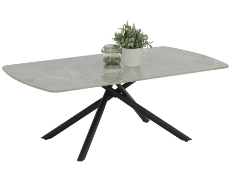 Obdĺžnikový konferenčný stolík so zaoblením je vyrobený v imitácii šedého mramoru. Moderný dizajn stolíka podčiarkuje extravagantne členitá podnož z čierneho kovu, ktorá dáva stolíku stabilitu a zároveň zaujme na pohľad.