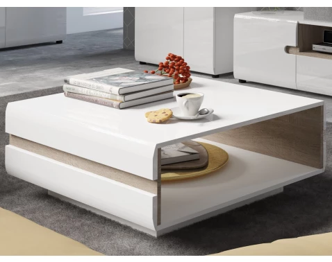 Štvorcový konferenčný stolík z kolekcie Linate s drevodekorom dub Truffel a bielymi plochami vytvára elegantný kontrast, ideálny do moderného interiéru.