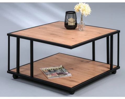 Štvorcový konferenčný stolík 75x75 cm v dub artisan a čiernej kovovej konštrukcii na kolieskach. Ideálny na odkladanie ovládačov, kníh a dekorácií.