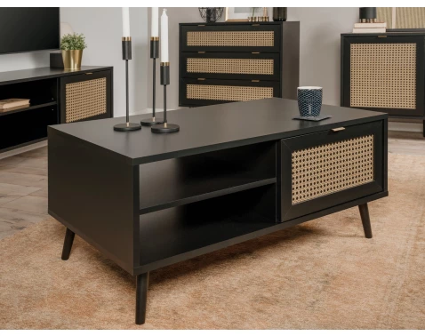 Konferenčný stolík v čiernej farbe s imitáciou viedenského výpletu, úložný priestor a masívne nožičky. Elegantný a praktický doplnok do štýlového interiéru.