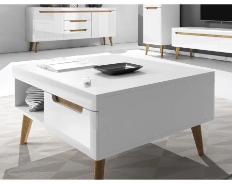 Konferenčný stolík so zásuvkami z kolekcie Nordi - inšpirujte sa útulným severským štýlom. Moderný nábytok v kombinácii dub/biela lesk dopĺňajú drevené nožičky.