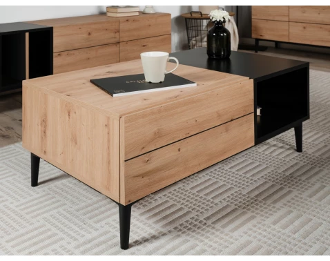 Konferenčný stolík so zásuvkou z kolekcie Nola - ak máte radi moderný a zároveň zaujímavý design, potom je tento nábytok práve pre Vás. Útulný dubový drevodekor dopĺňa kontrast zaujímavo vsadených čiernych plôch, čiernej horizontálnej línie a čiernej podnože. Masívne pôsobiaci nábytok so zosilnenými rámami tak vďaka nôžkam vyzerá odľahčene a zároveň umožňuje jednoduchšiu údržbu podlahy.