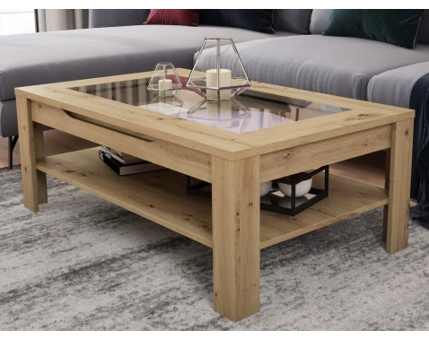 Priestranný konferenčný stolík o veľkosti 110x67 cm je navyše doplnený odkladacou priehradkou a úložnou zásuvkou. Vyrobený v drevodekore dub artisan. Horná plocha stolíka je zaujímavo kombinovaná tvrdeným sklom, ktoré poskytuje priehľad do priestoru zásuvky. Máte tak vždy časopisy, noviny alebo veci dennej potreby prehľadne uložené na dosah ruky. Presklenú časť môžete prípadne využiť aj ako priestor na vystavenie fotiek alebo obľúbených dekorácií na zútulnenie atmosféry vášho domova.
