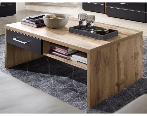 Moderný konferenčný stolík so zásuvkou a priehradkou v kombinácii čierny/dub wotan vytvára skvelý kontrast a zaujme na pohľad.