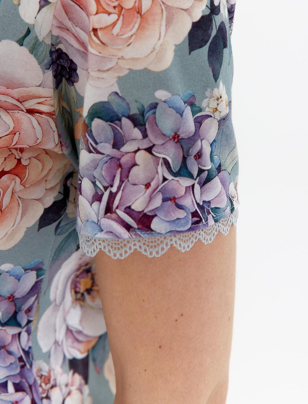 Dámske tričko - vysokokvalitná bavlna zdobená pastelovými kvetmi - krátke rukávy zdobené čipkou - špicatý výstrih - dĺžka pred kolená 100 % bavlna