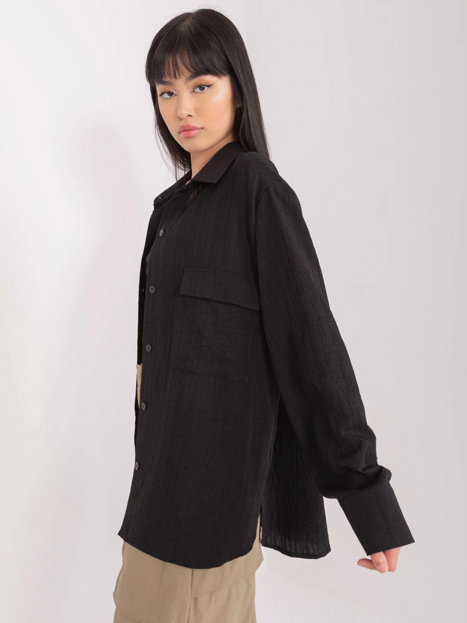 Čierne dámske oversize tričko s golierom . kód výrobku: LK-KS-509356.27P dominantný vzor: rôznorodá textúra tkaniny štýl: ležérny príležitosť: ležérna, na prechádzky, do mesta, do práce Modelka má na sebe veľkosť S/M. Rozmery modelky: výška 167 cm, prsia 73 cm, pás 64 cm, boky 91 cm. Rozmery trička vo veľkosti S/M merané na plocho: šírka v podpazuší - 59 cm, dĺžka rukávu - 63 cm, celková dĺžka (vpredu) - 67 cm, celková dĺžka (vzadu) - 72 cm.Veľkosť Alt.VýškaObvod hrudníkaVonkajší. dĺžka. rukávVnútorný. dĺžka rukávovM/L38/40162-17486-9161-6351-53S/M36/38160-17282-8659-6149-51L/XL40/42164-17891-9663-6553-55