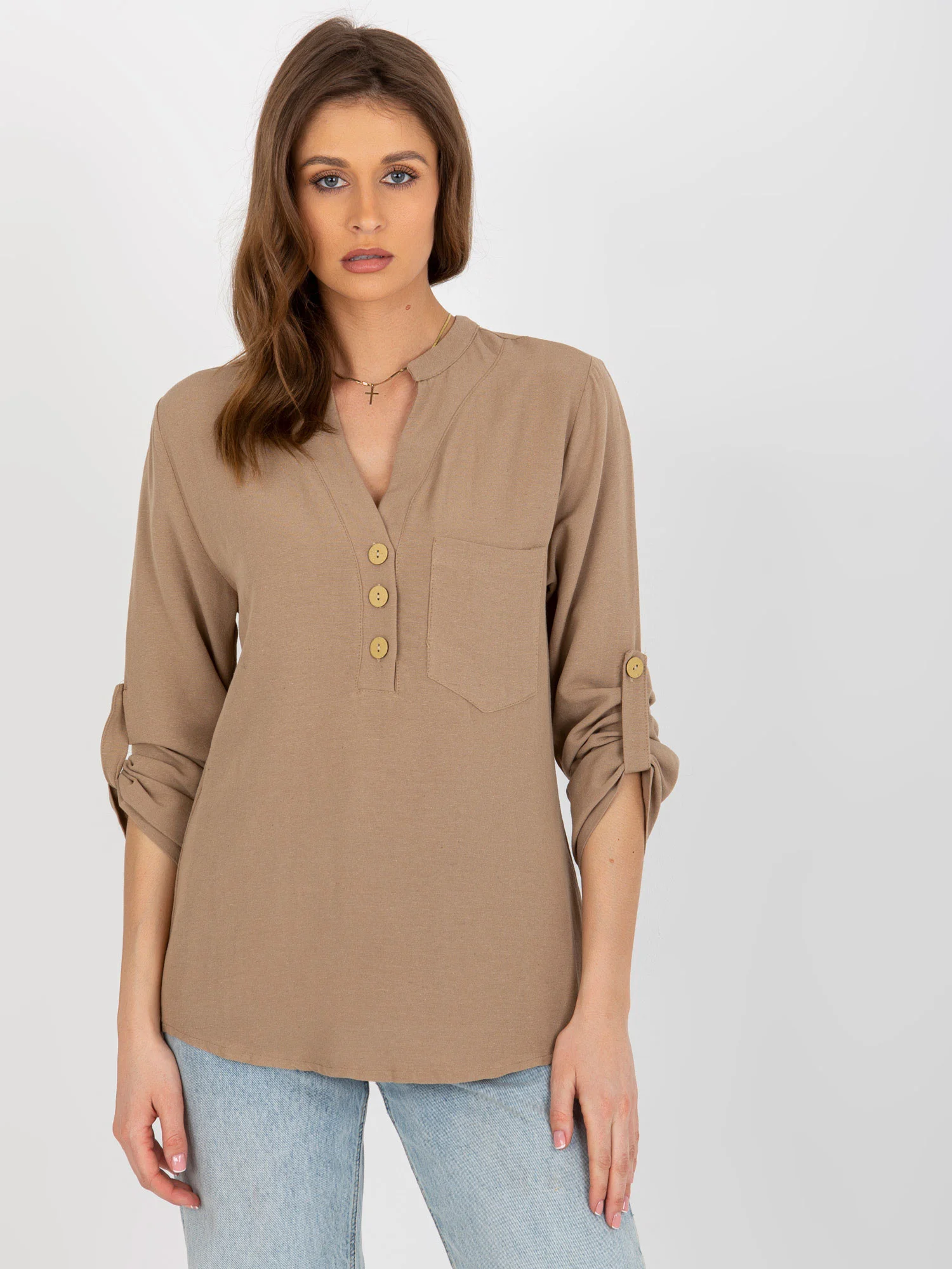 Tmavobéžová košeľová blúzka na gombíky od značky RUE PARIS . Kód výrobku: WN-KS-VE51.11X dominantný vzor: hladký štýl: boho príležitosť: ležérne, pracovné, letné Modelka má na sebe veľkosť S. Rozmery modelky: výška 176 cm, prsia 85 cm, pás 64 cm, boky 92 cm. Rozmery blúzky vo veľkosti S merané na plocho: šírka v podpazuší - 50 cm, dĺžka rukáva - 57 cm, celková dĺžka - 71 cm.Veľkosť Alt.VýškaObvod hrudníkaVonkajší. dĺžka. rukávVnútorný. dĺžka rukávovS36160-164825949M38162-172866151L40164-174916353XL42166-178966555