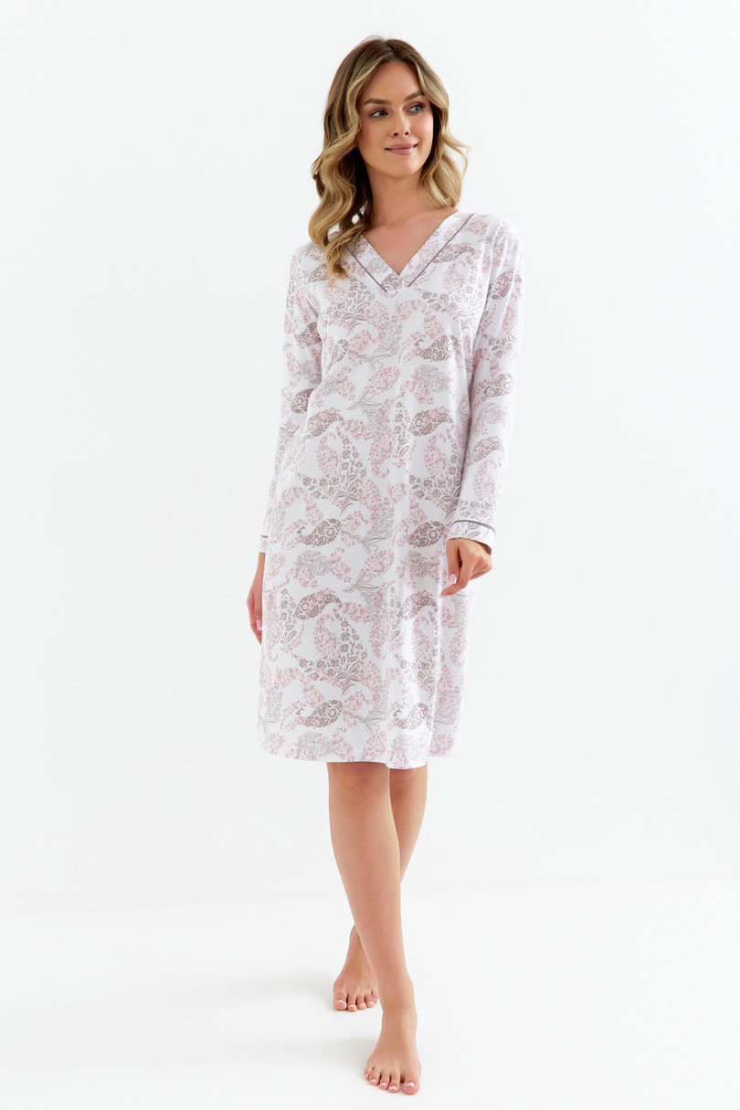 Dámske tričko model 425 Dámska košeľa 425 z vysokokvalitného bavlneného úpletu ženský trojuholníkový výstrih s lemami a lemovaním v kontrastnej farbe klasický strih dlhé rukávy s lemovaním farby svetloružová, kakaová na bielej Zloženie: 100 % bavlna