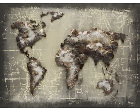 Ručne vyrobený kovový obraz 80x60 cm s 3D efektom a motívom mapy sveta, v šedej farbe, vytvára jedinečnú retro dekoráciu do vášho interiéru.