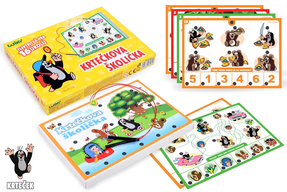 Krtečkova školička. Poznávací hra. V elektronické hře Školička mají děti za úkol odhalovat souvislosti mezi obrázky a propojovat je vodivým drátkem. Každý list je zaměřen na určitou oblast dětského světa. Hra rozšiřuje vědomosti, vyžaduje postřeh, nutí děti všímat si vztahů mezi předměty, porovnávat je podle určitých vlastností a přiřazovat odpovídající předměty k sobě, bez nutnosti umět číst, neboť listy neobsahují žádné texty. Správnou odpověď na otázku signalizuje rozsvícené zelené světélko…