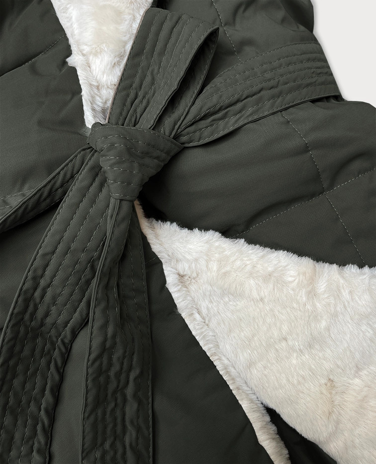 Pri výbere veľkosti venujte pozornosť nižšie uvedenej veľkostnej tabuľke. Veľkosti nezodpovedajú bežne nosenému oblečeniu. Bunda s opaskom Bunda má jednoduchý strih, je ľahko zateplená syntetickou páperovou výplňou, má opasok na zapínanie, dve vrecká na zips a zapína sa na patentky. Model je podšitý kožušinou a má stojatý golier. Na koncoch rukávov sú skryté lemy na sťahovanie. Bunda má dĺžku pod boky. Materiál: 100 % polyester.