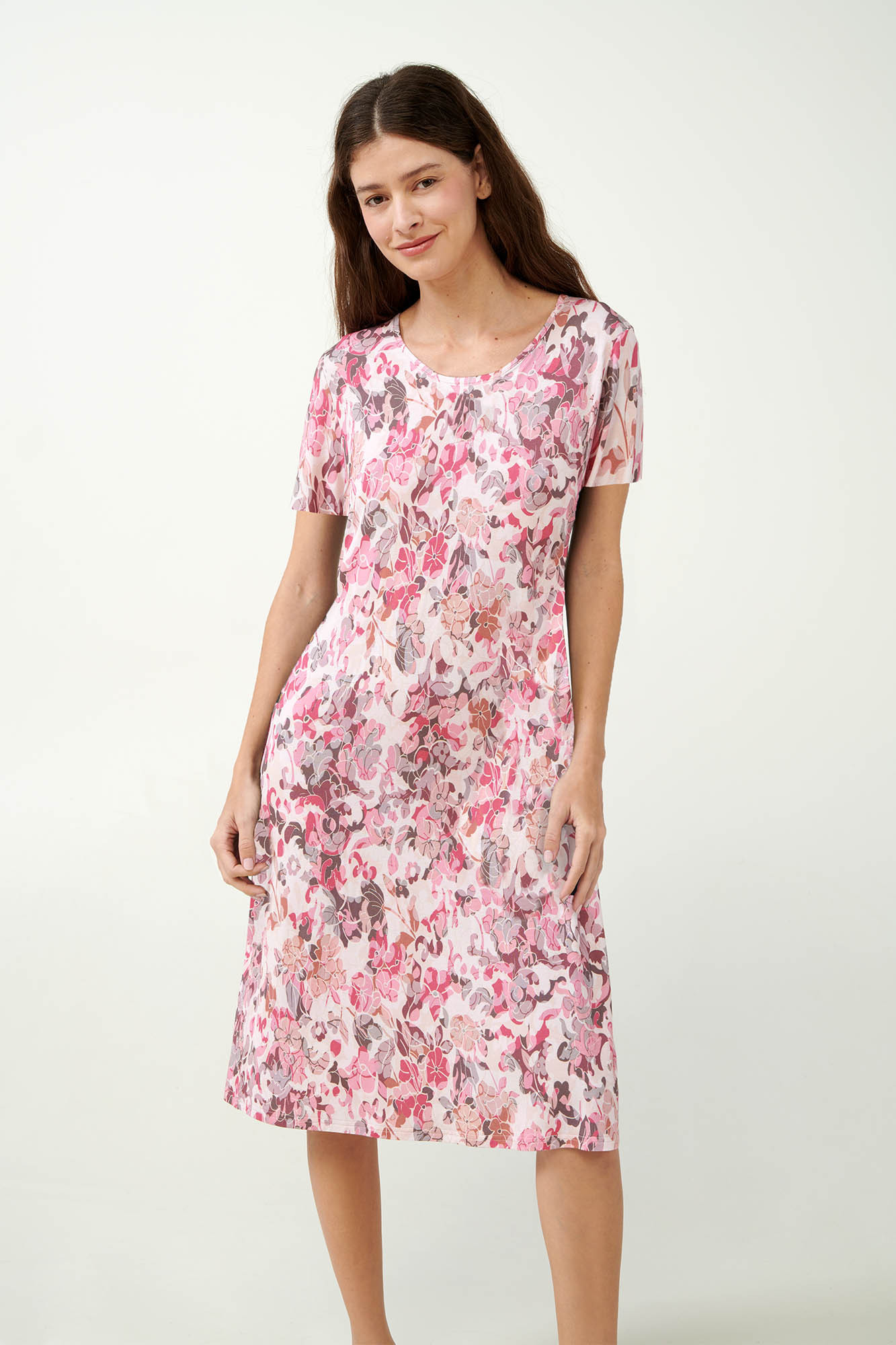 LENZING Tencel Modal Micro 93% + Elastan 7%. Dĺžka: 105 cm. Model: výška 175 cm, veľkosť: Small. Táto kvetinová nočná košeľa v jemnej ružovej farbe v sebe spája eleganciu a pohodlie. Tkanina je vyrobená z prvotriedneho mikromodalu, ktorý je na pokožke luxusne mäkký a priedušný, takže je ideálny na pokojný spánok. Kvetinový vzor dodáva nádych ženskosti, zatiaľ čo voľný strih zaručuje ľahký pohyb a pohodlie. Táto nočná košeľa je ideálna na leňošenie alebo spánok a je krásnym doplnkom vašej zbierky nočného oblečenia.