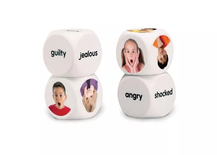 Sada obsahuje štyri kocky: dve kocky zobrazujú fotografie multikultúrnych detí vyjadrujúcich rôzne emócie, a dve kocky obsahujú emocionálne slová. Cieľom je spojiť fotografiu s odpovedajúcim slovom a precvičiť tak rozpoznávanie a pomenovanie emócií. Dokážete ich spojiť?