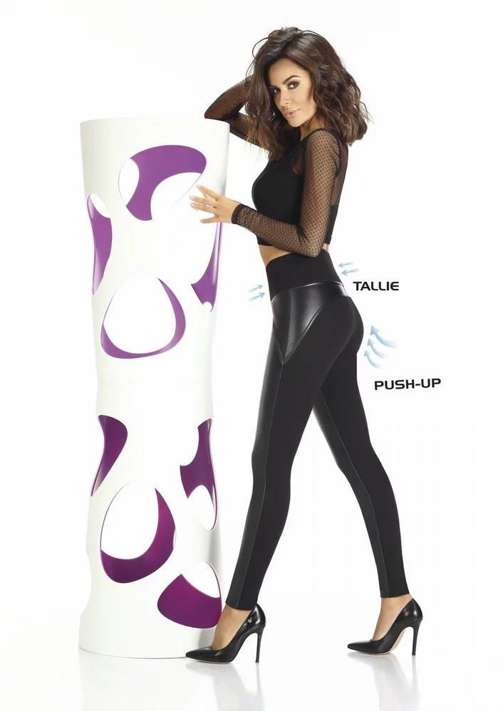 Štýlové legíny z elastického materiálu s prídavkom eko-kože, z materiálu SQUEEZE + ECO LEATHER s efektmi push - up pozvedajícím zadoček, pas spevnený pomocou širokej gumy v páse, opticky zoštíhlené nohy. Predná strana je z ekokože 200 DEN Zloženie: 62% viskóza, 28% polyester, 10% elastan.
