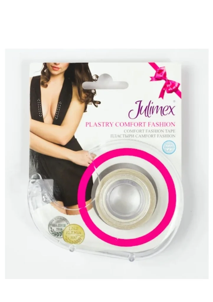 Transparentné 20 mm pásiky Julimex sú obojstranne lepiace, jedna strana sa prilepí na telo a druhá na oblečenie. Pásiky sú diskrétnym riešením pre hlboké dekolty alebo vyčnievajúce časti oblečenia. dĺžka 3 m.