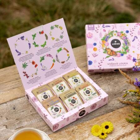 Výber bylinných čajov v darčekovej kazete Voňavá Lúka. Doprajte si chvíle pokoja a pohody s naším výberom bylinných čajov Voňavá lúka. Táto darčeková kazeta obsahuje šesť starostlivo vybraných zmesí, ktoré vás prenesú do sveta prírodnej harmónie a osvieženia. Táto darčeková kazeta je ideálnym darčekom pre každého, kto si chce užiť prírodné čaje plné chuti a zdravia. Doprajte si Voňavú lúku a vychutnajte si každý okamih so šálkou lahodného bylinného čaju. Darčeková kazeta obsahuje 6 druhov bylinných čajov po 5 ks: Leros Levanduľové upokojenie, Leros Bylinková veselosť, Leos Bylinková energia, Leros Vnútorná harmónia, Leros Radostné zaspávanie, Leros Bylinkový detox.