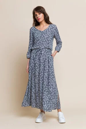 Klasické šaty s výstrihom do V - 3/4 rukávy so zapínaním na gombíky, dva rozparky a skryté vrecká. - V páse sa zaväzujú pomocou jemnej šnúrky, aby sa šaty prispôsobili tvaru vašej postavy. 100 % viskóza Kolekcia: jar/jeseň Pokyny na pranie: 30 °C Pranie v ruke